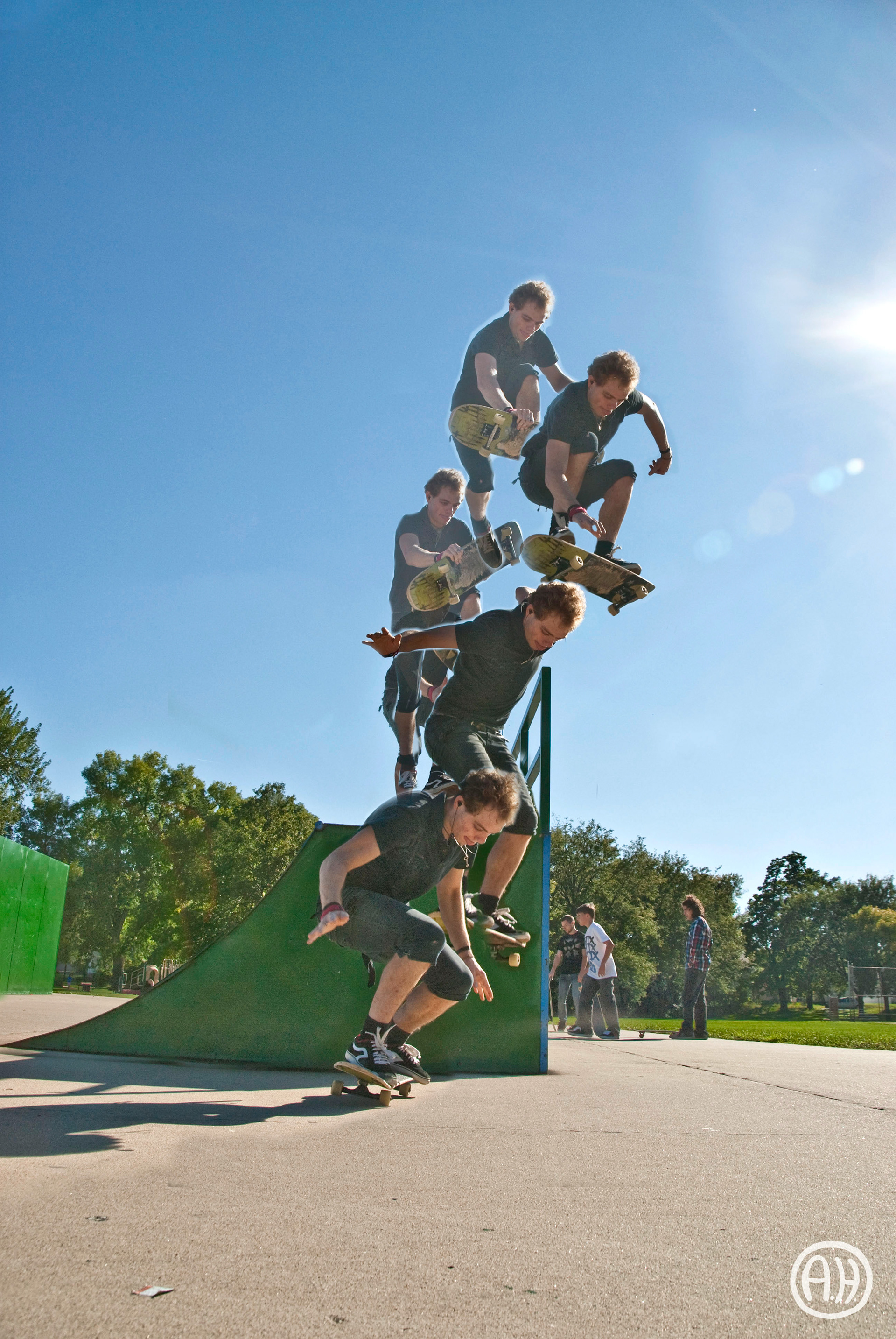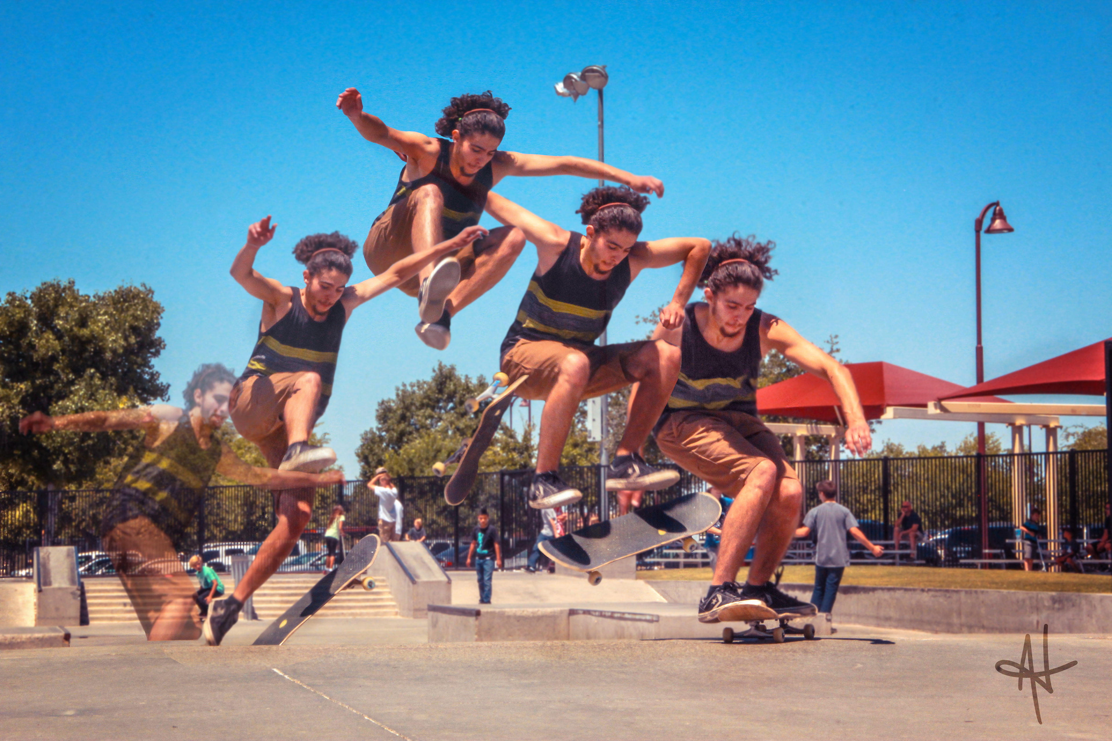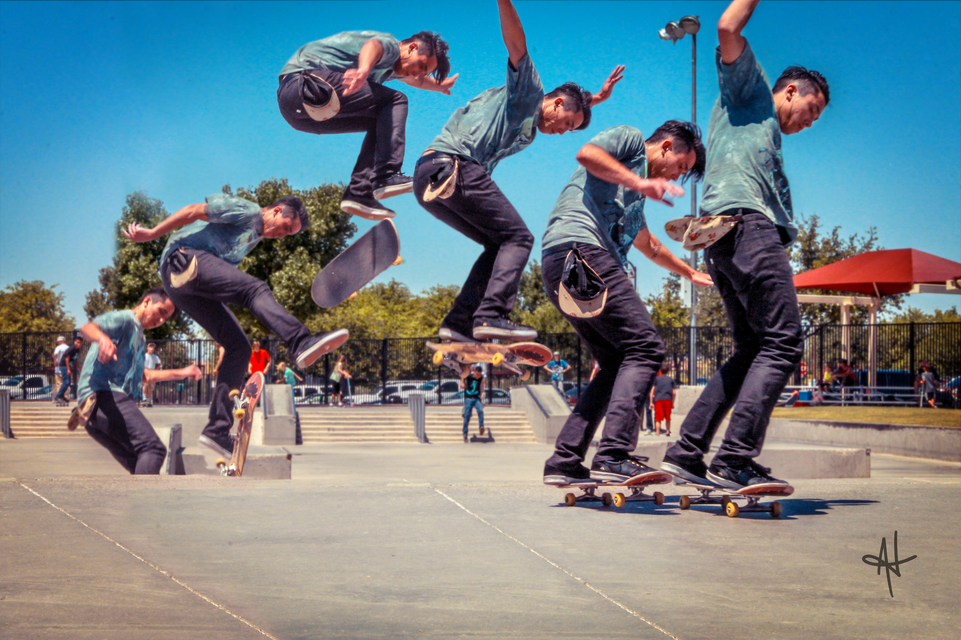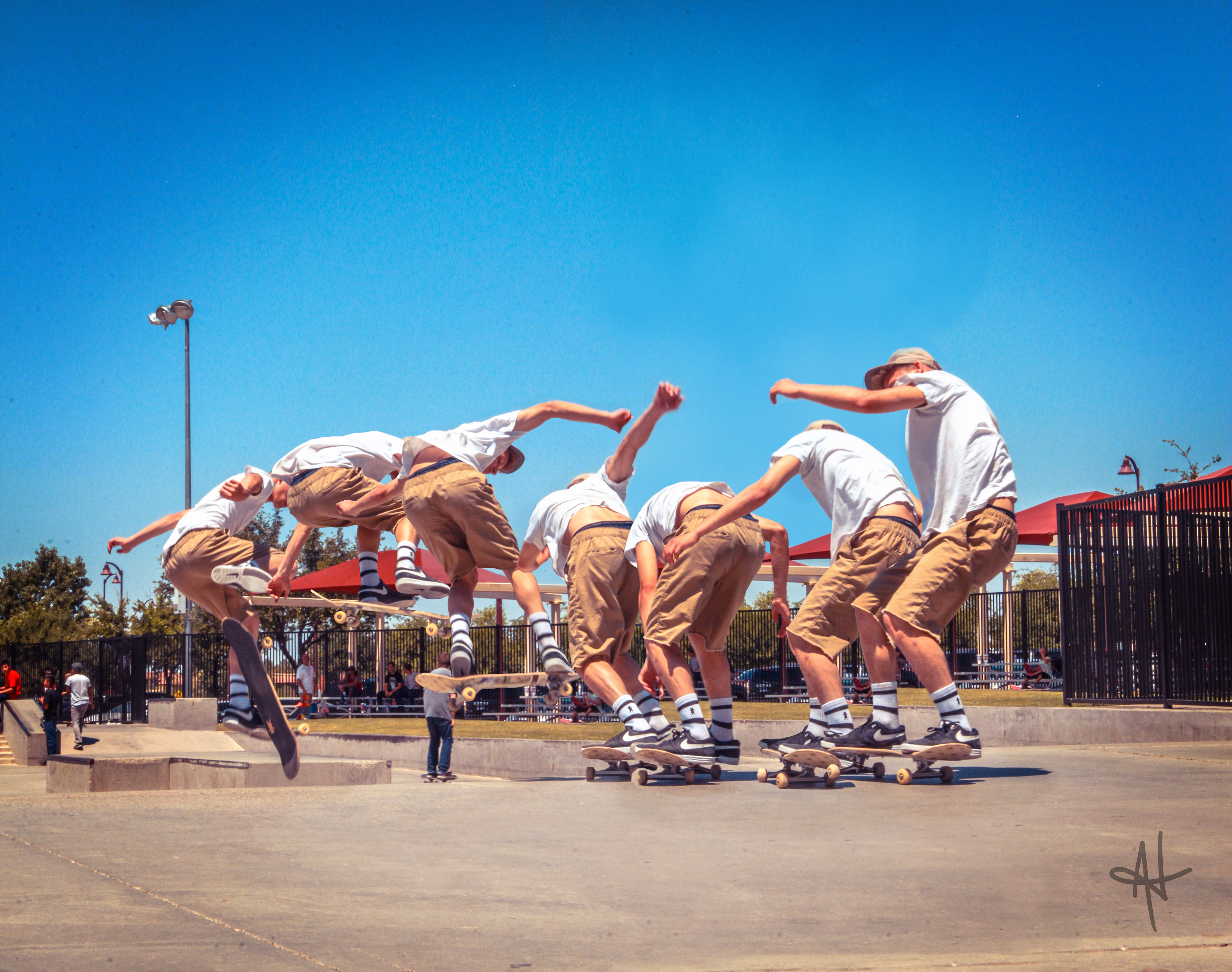 A composite series of skateboarders performing tricks, layered into a single image to illustrate the full progression of movement.